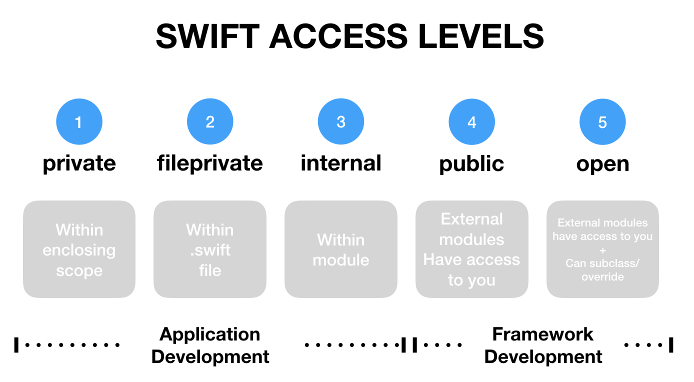 Swift에서는 5가지의 다른 접근 레벨 제공합니다.