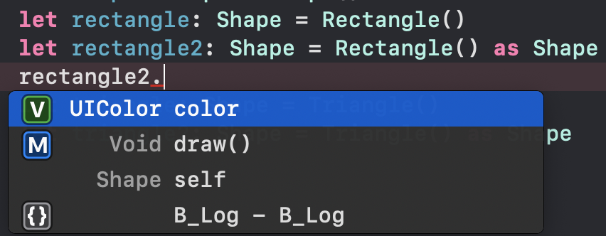 Rectangle의 cornerRadius프로퍼티가 있음에도 불구하고, Upcasting 성공시 Shape(부모)의 프로퍼티와 메서드만 보여지는걸 알 수 있다.