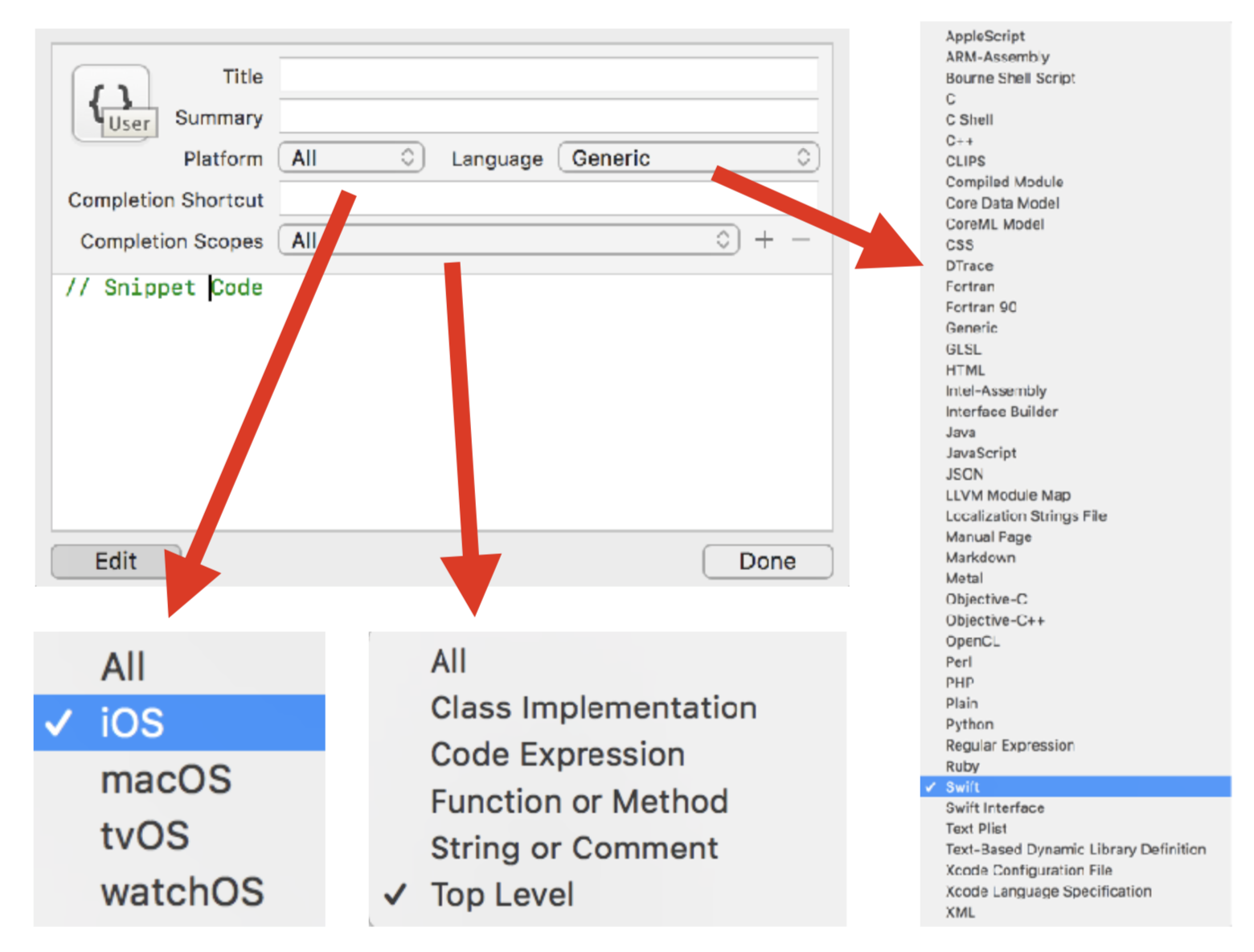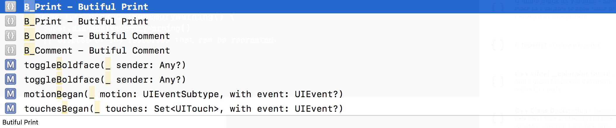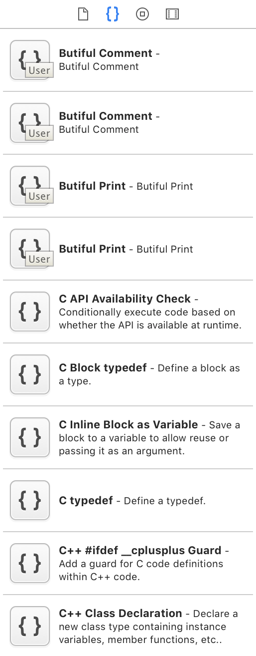 Xcode에서 기본적으로 제공하는 Snipptes뿐만 아니라 자기가 원하는 코드를 커스텀하여 저장할 수 있습니다.