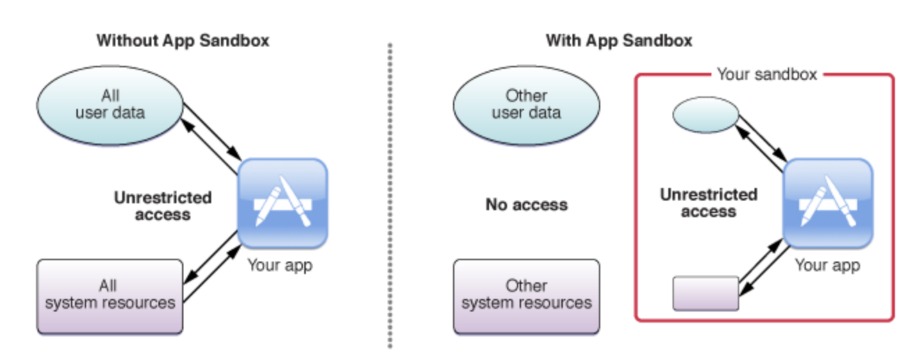 샌드 박스가 아닌 앱은 해당 앱을 실행하는 사용자의 모든 권한을 가지며 사용자가 액세스 할 수있는 모든 리소스에 액세스 할 수 있습니다.