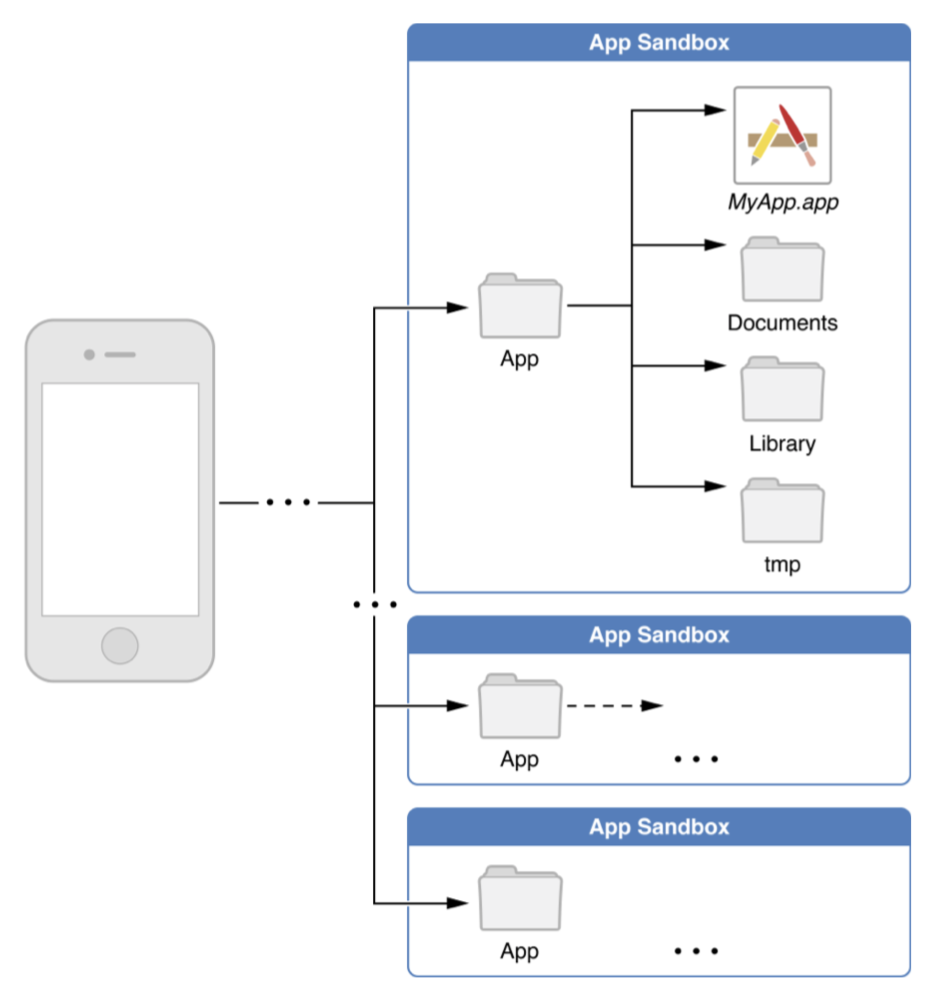 iOS는 위의 그림과 같이 보안상의 이유로 앱 하나당 전부 SandBox화 되어있습니다.