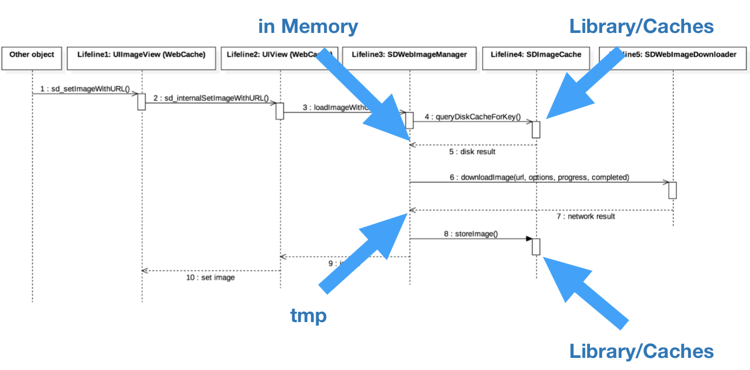 - Library/Caches폴더에 캐쉬된 이미지가 없으면 downloadImage(url, options, progress, completed)메서드를 이용해 다운을 받고 tmp폴더에 잠시 저장했다가(앱 시작중에는 데이터 유지가 필요하지 않기 때문에), Library/Caches폴더에 저장하는 형태입니다.