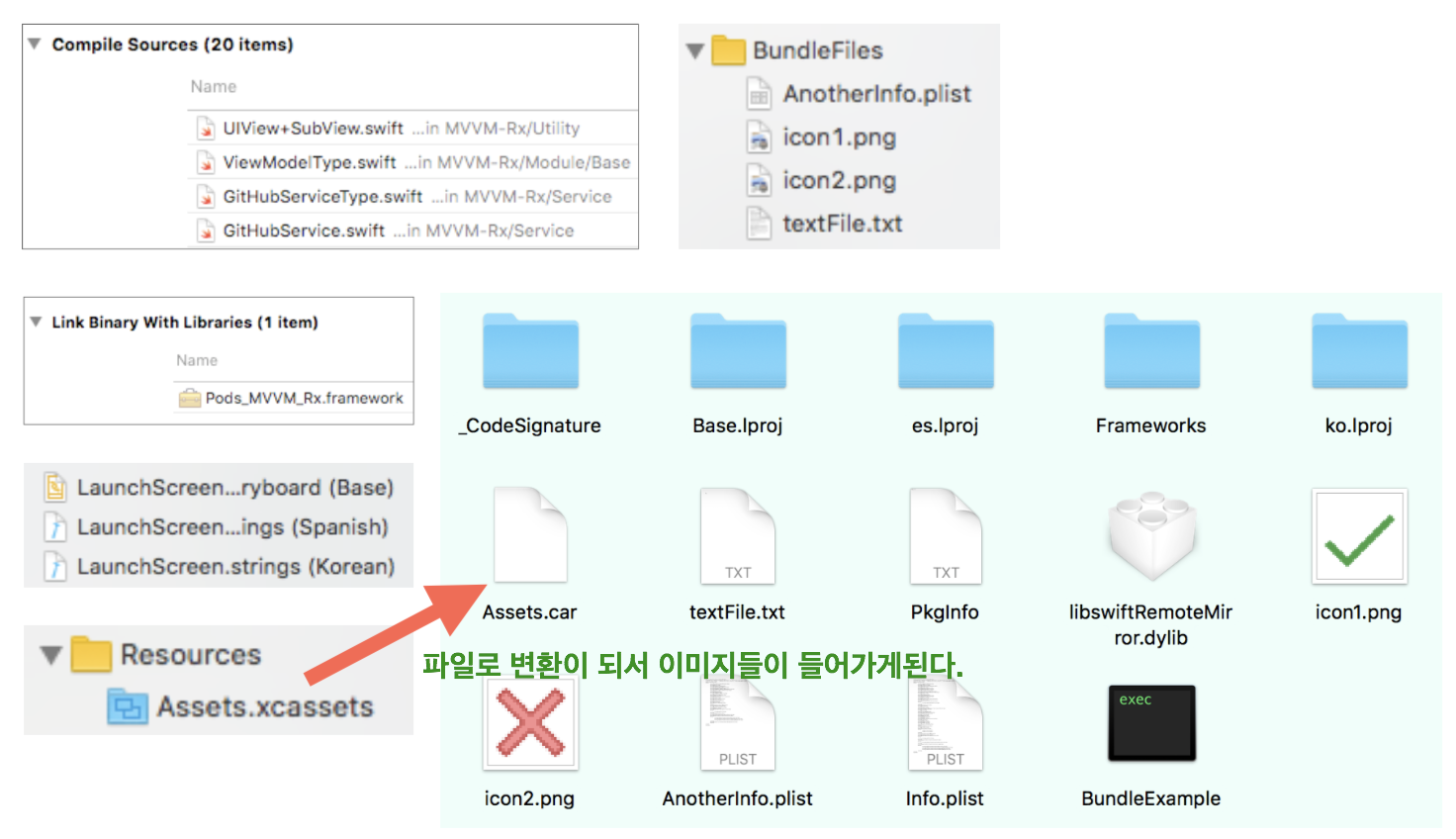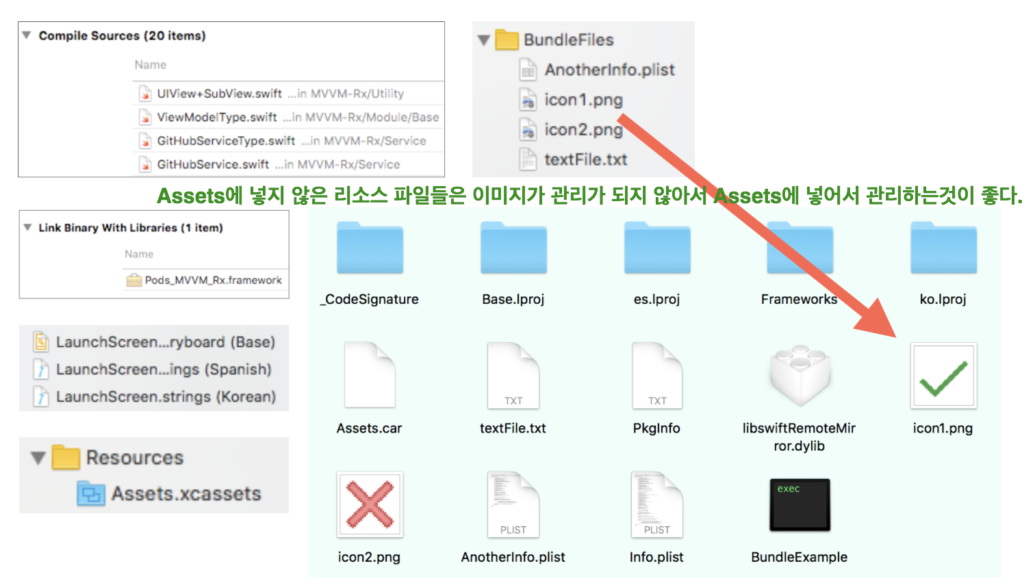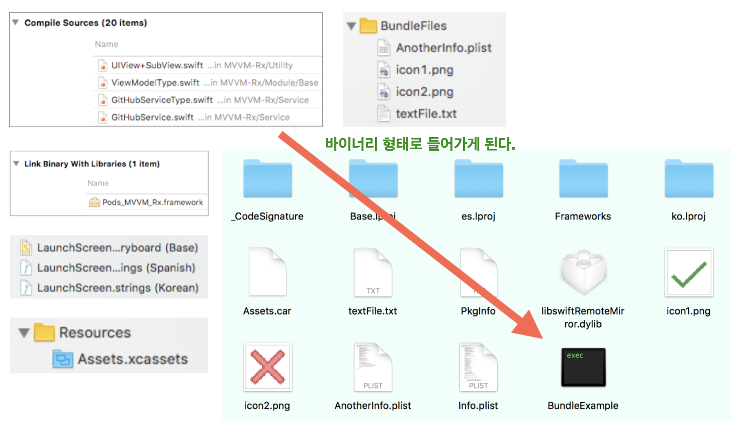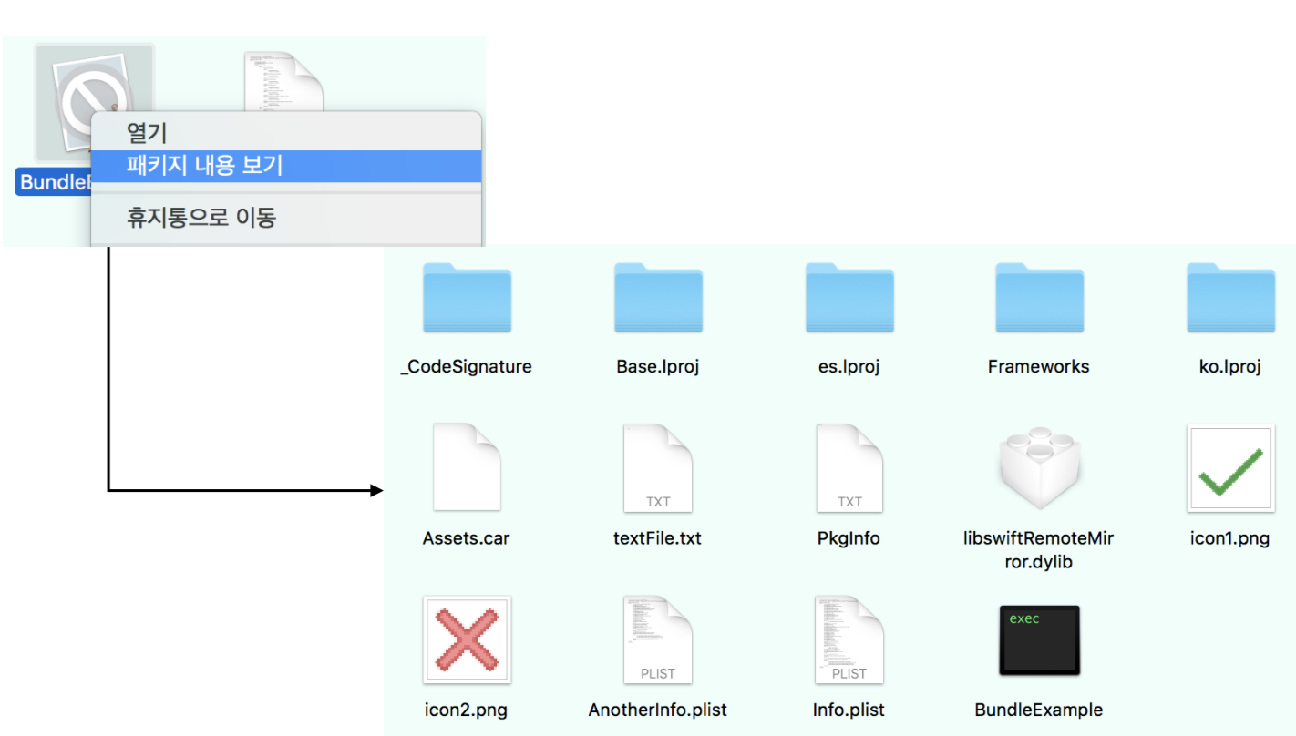 - 실행 가능(Executable)파일, info.plist, Resources(이미지, 사운드, strings 등)등을 함께 그룹화 합니다.
