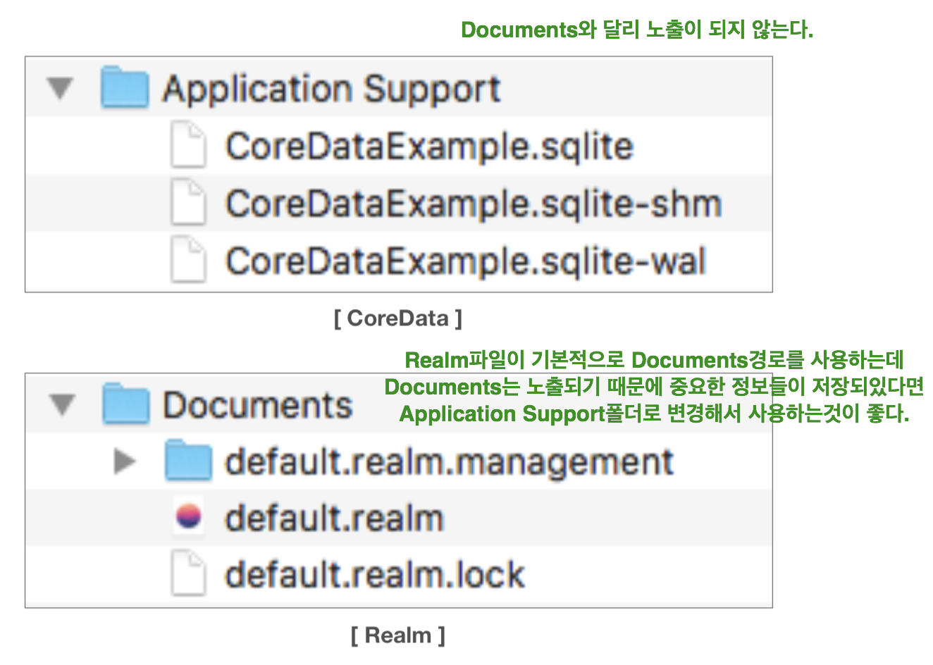 Realm은 파일이 기본적으로 Documents경로를 사용하는데 Documents폴더는 노출되기 때문에 중요한 정보들이 저장되어있다면 Application Support폴더로 변경해서 사용하는것이 좋다.