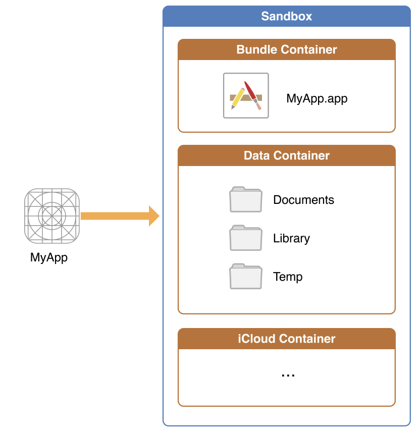 Bundle 컨테이너 디렉토리는 앱의 Bundle을 보유하고 Data 컨테이너 디렉토리는 앱과 사용자 모두에 대한 데이터를 보유합니다. 이 디렉토리는 앱이 데이터를 정렬하고 구성하는데 사용할 수 있는 여러 하위 디렉토리로 더 나뉩니다. 앱은 런타임에 추가 컨테이너 디렉토리(예 : iCloud 컨테이너)에 대한 접근을 요청할 수도 있습니다.