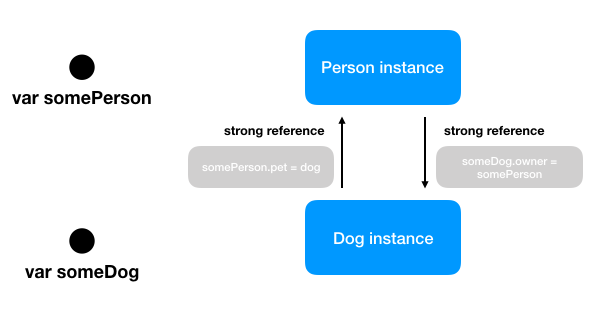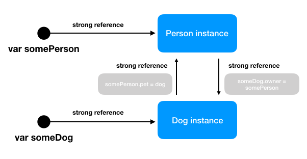 somePerson과 someDog에 nil을 할당해서 해제를 시키면 아래와 같은 상황이 메모리가 아직 다 해제가 되지 않게됩니다.