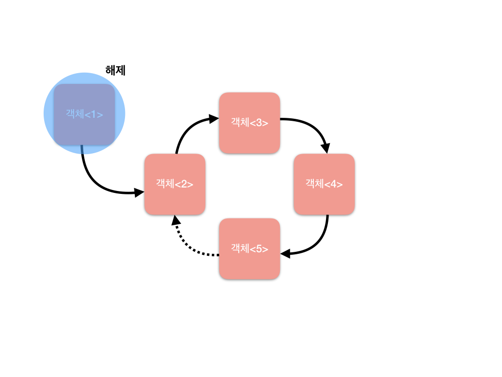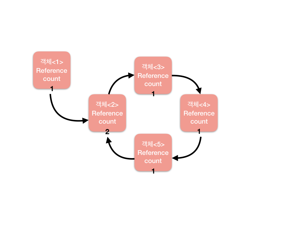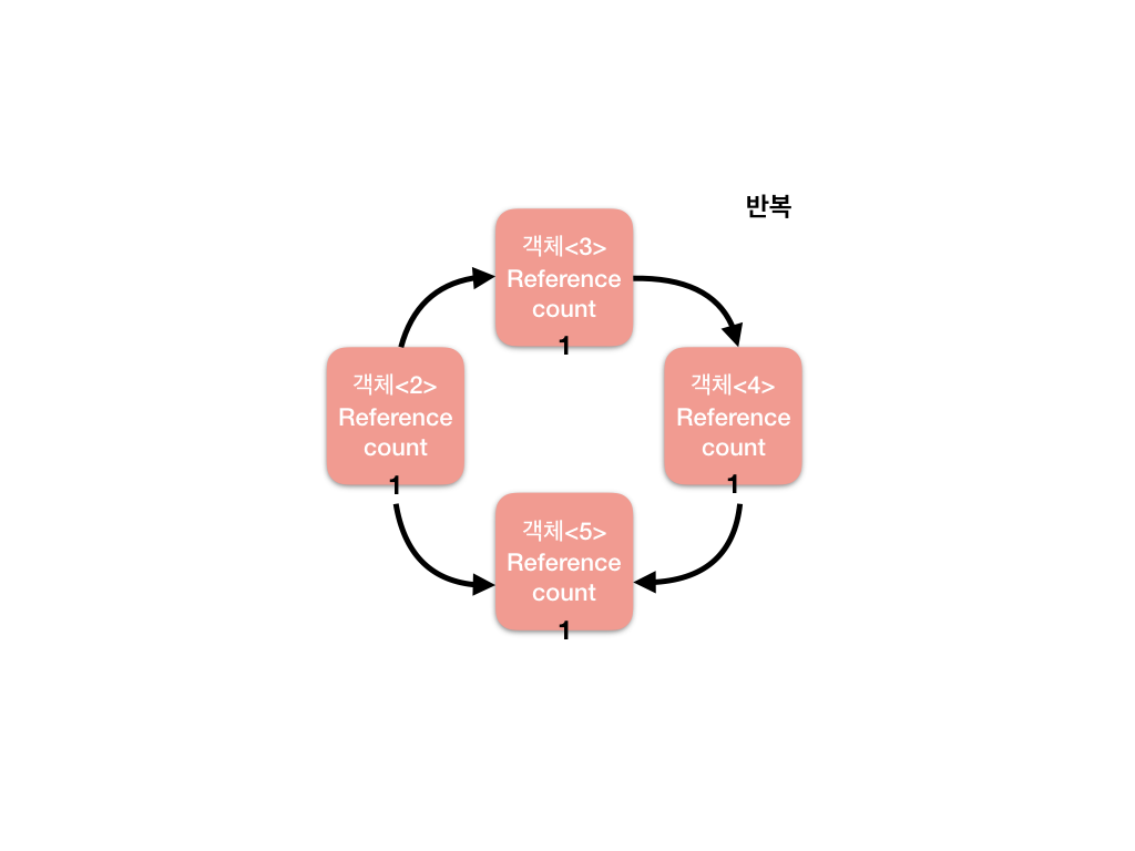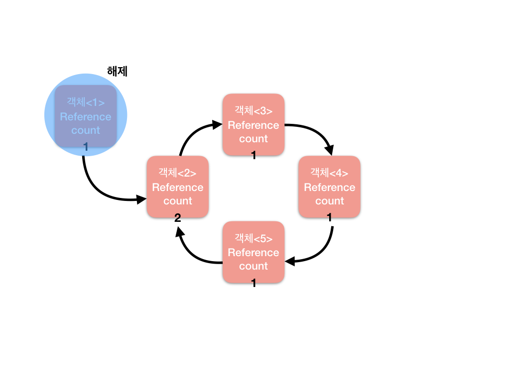 - 활성화된 참조카운트가 하나라도 있을 경우 메모리에서 해제 되지 않음