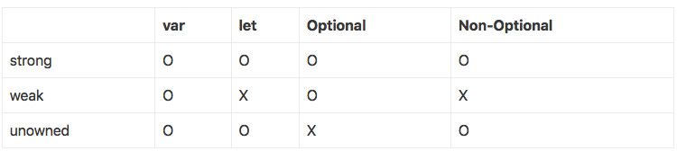 - strong : 기본값. 강한 참조. Reference Count 1 증가