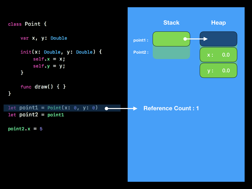 ⇧ point2에 point1을 할당. Reference Count 2 증가