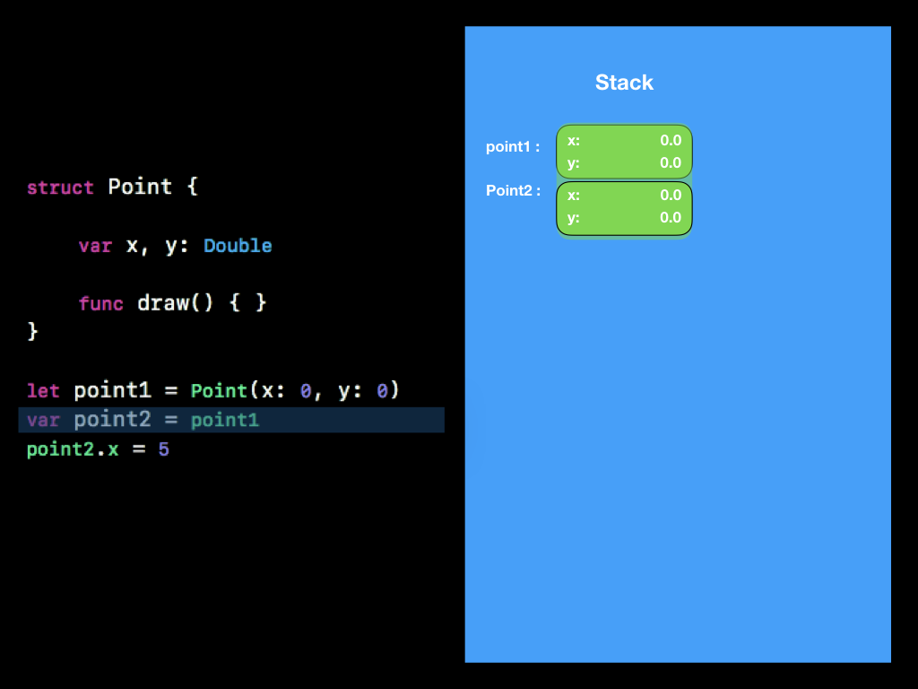 ⇧ Struct는 클래스처럼 같은 주소를 바라는것이 아니라, 복사하여 다른 Stack에 저장된다.