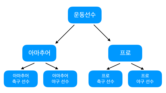 이 구조를 자세히 보면 아마추어, 프로 두 클래스 모두는 하위 클래스로 별도의 축구선수와 야구선수를 가집니다. 즉, 이러한 구조는 클래스간에 수많은 중복 코드를 갖게 요구할 것 입니다.