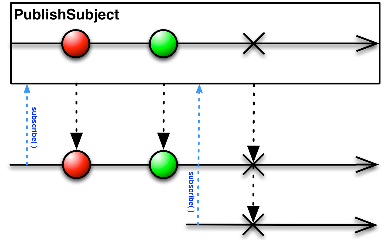 PublishSubject는 .completed, .error이벤트가 발생할때까지, 즉 종료될때까지 subscribe한 이후부터 이벤트를 방출 합니다.