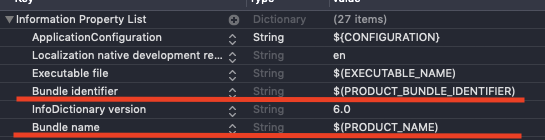info.plist에 가보면 Bundle identifier와 Bundle Name이 존재하는것이 보이는데