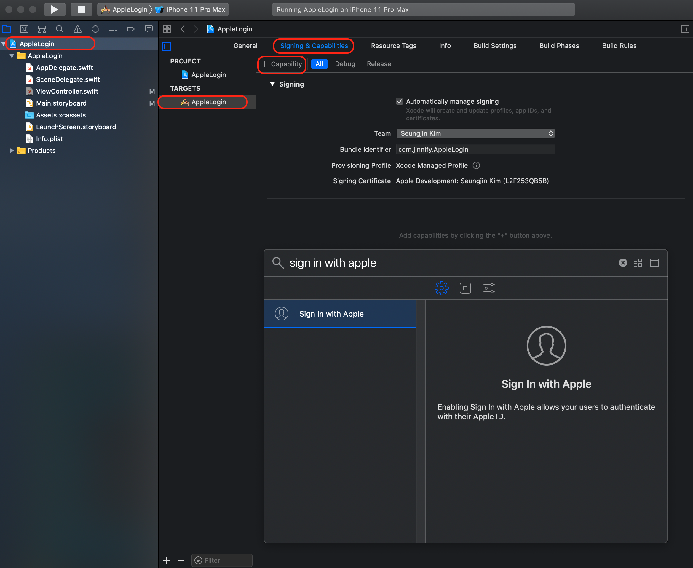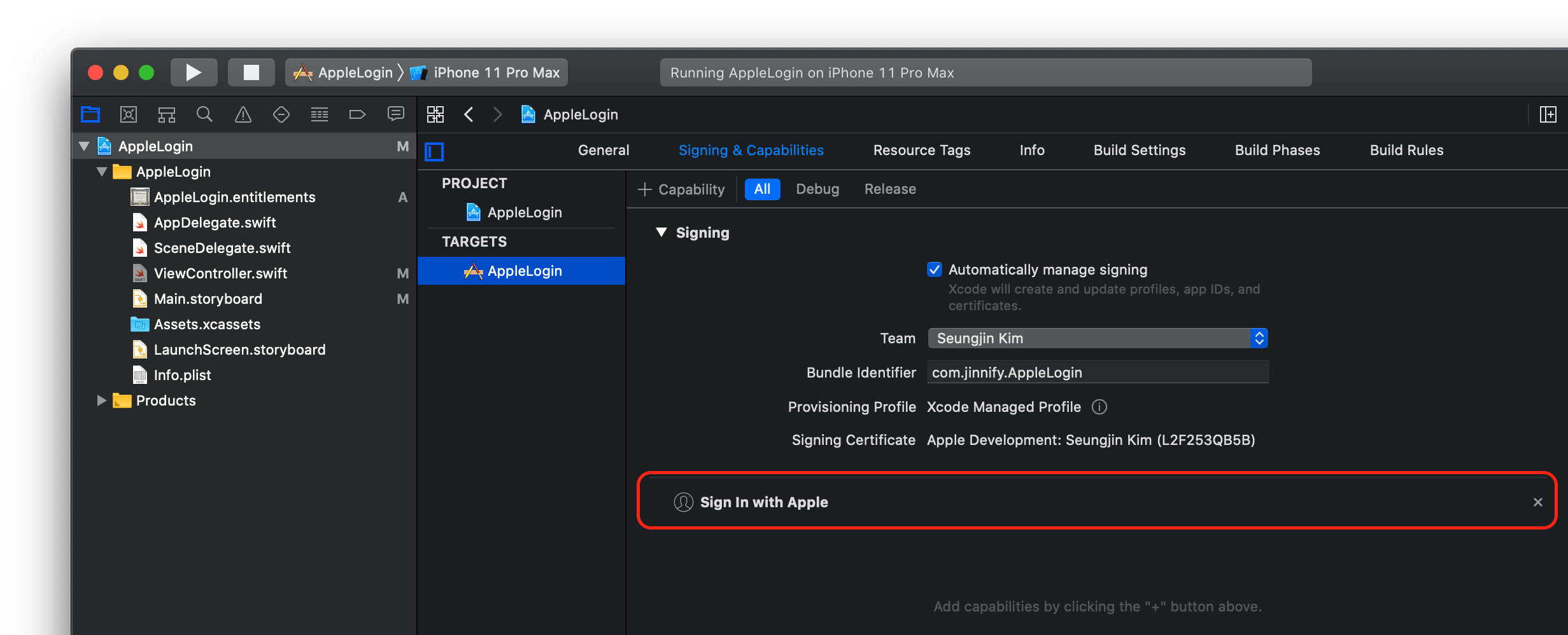 capability에서 sign in with apple을 추가해주는 작업이 남아있습니다.