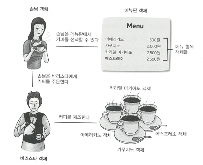 그림과 같이 메뉴판, 손님, 바리스타, 커피들처럼 존재하거나 생각할 수 있는 것들을 객체라고 본다.