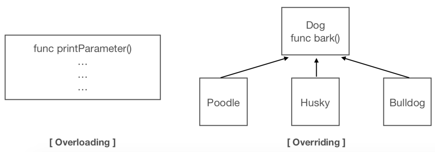 이와 같은 다형성의 방식으로 오버라이딩(Overriding), 오버로딩(Overloading)을 지원합니다.