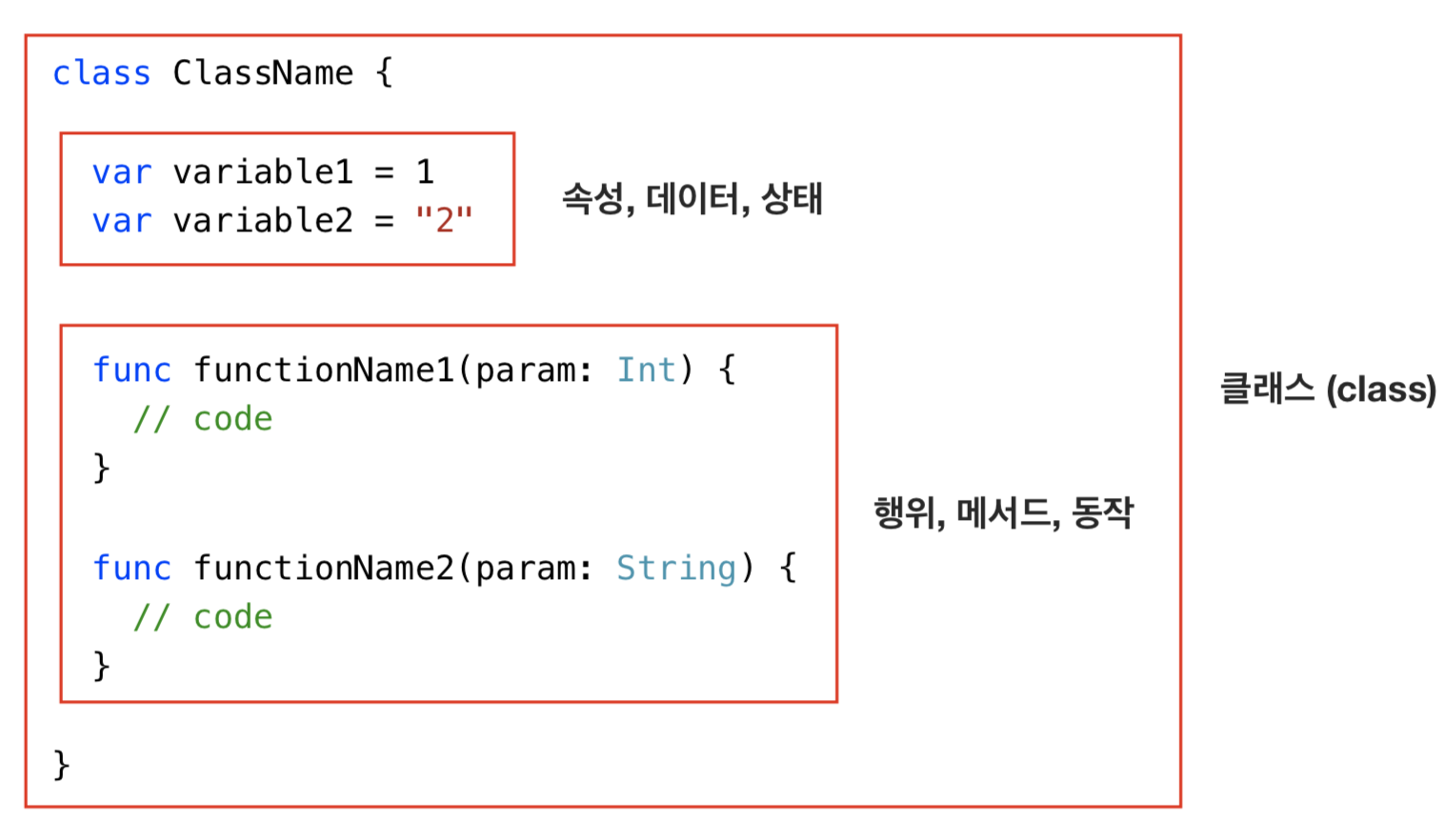 코드로 살펴보면 상태를 나타내는 데이터, 행위를 나타내는 메서드가 들어있다.