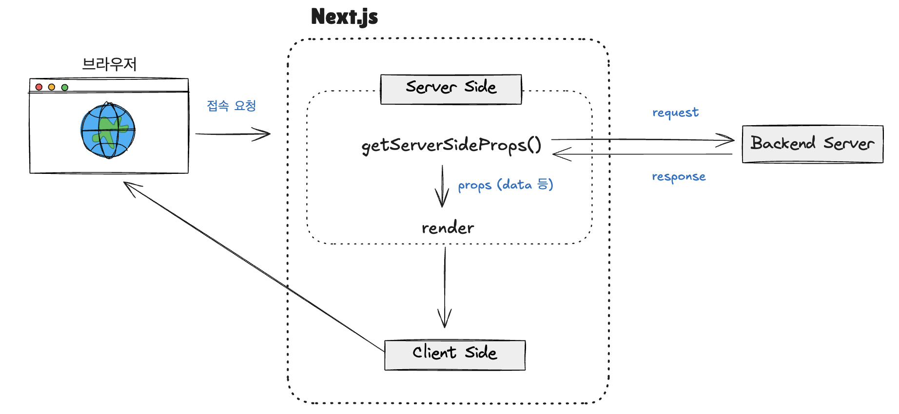 하지만, 백엔드 서버에서 데이터 요청이 늦어지는 경우에는 클라이언트 → 브라우저까지 렌더링 흐름이 전부 늦어지는 단점이 존재합니다.